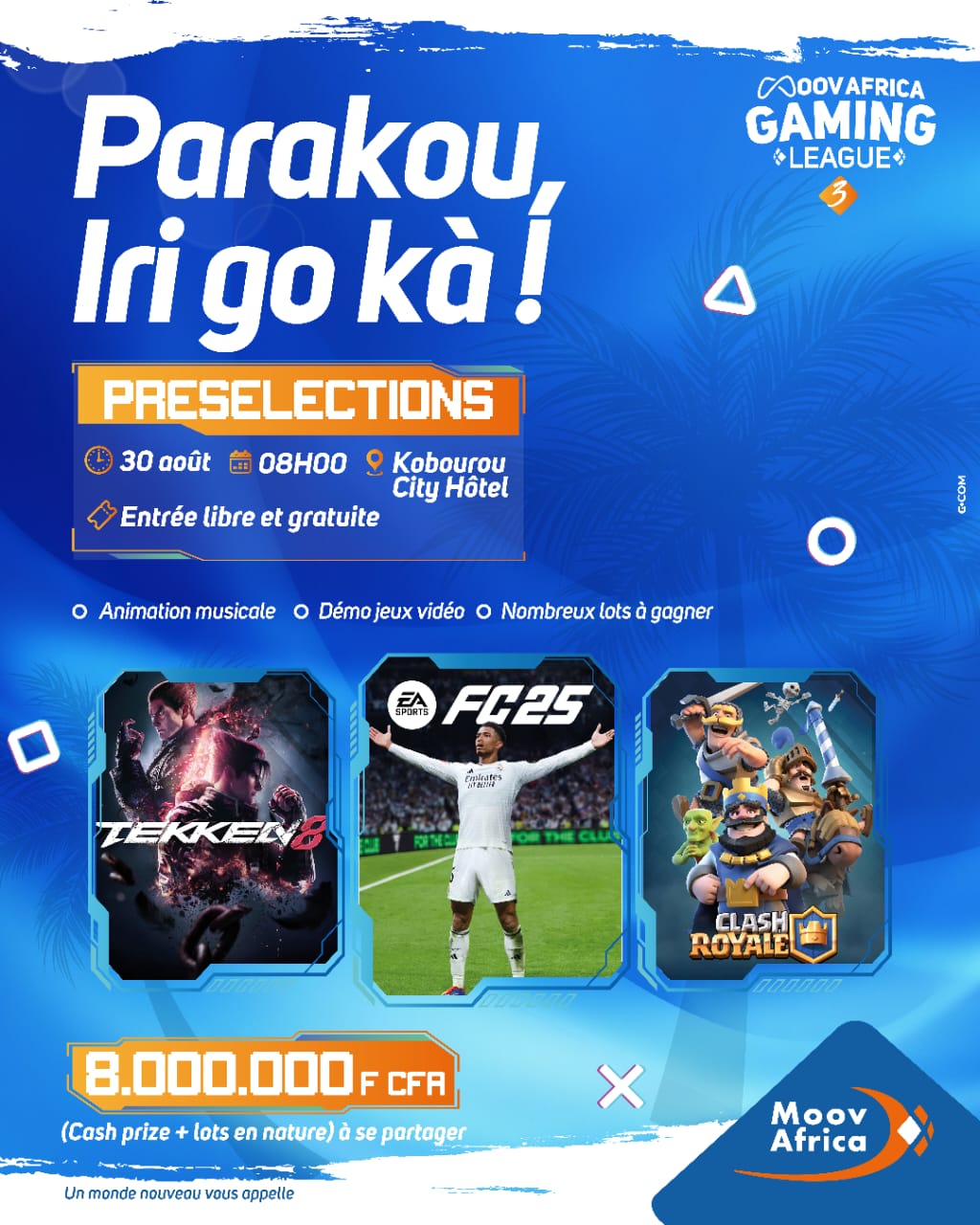Moov Africa Bénin présente la troisième édition de Moov Gaming League, une compétition de gaming pour les passionnés de jeux vidéo. Pour cette 3ème édition, nous avons 3 jeux en compétition : TEKKEN 8, EA Sports FC 25 et Clash Royale.