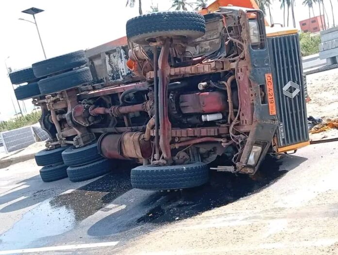 Un accident de la circulation est survenu le samedi 3 janvier 2026 sur la route des Pêches, à hauteur d’Adounko, dans la commune de Cotonou. Un camion-benne en provenance du carrefour Togbin, s’est renversé après une perte de contrôle de son conducteur.