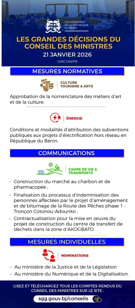 AccueilPolitiqueConseil des ministres : voici les grandes décisions Politique Conseil des ministres : voici les grandes décisions By Lamazone janvier 21, 2026 0 63 Partager FacebookTwitterPinterestWhatsApp Le gouvernement de Patrice Talon s’est réuni en Conseil des ministres ce mercredi 21 janvier 2026. Plusieurs décisions ont été prises. Partager FacebookTwitterPinterestWhatsApp Article précédentMercato : Benoît Tavenot succède à Stéphane Le Mignan au FC MetzArticle suivantConseil des ministres : voici toutes les nominations prononcées Lamazone RELATED ARTICLES Politique Arrestation de Hugues Sossoukpè : RSF porte plainte contre le Bénin et la Côte d’Ivoire devant la CEDEAO avril 28, 2026 Politique CRIET : 2 ans de prison ferme pour Julien Kandé Kansou avril 28, 2026 Politique Bénin : les États-Unis saluent la victoire de Romuald Wadagni avril 24, 2026 LAISSER UN COMMENTAIRE Annuler la réponse Commenter : S'il vous plaît entrez votre commentaire! Nom :* S'il vous plaît entrez votre nom ici Email :* Vous avez entré une adresse email incorrecte! Veuillez entrer votre adresse email ici Site : Enregistrer mon nom, email et site web dans ce navigateur pour la prochaine fois que je commenterai. - Advertisment - Most Popular Real Madrid : Eder Militao opéré avec succès avril 28, 2026 Real Madrid : Aurélien Tchouaméni vers une prolongation avril 28, 2026 Ouidah : trois accidents de route en 24H, voici le bilan avril 28, 2026 Parakou : 6 policiers condamnés pour la mort de Fayçal Ouorou avril 28, 2026 Voir plusCommentaires récentsA WordPress Commenter dans Hello world!