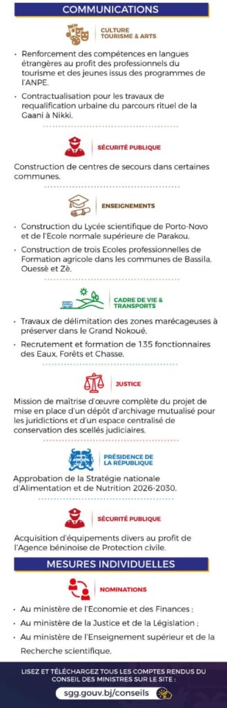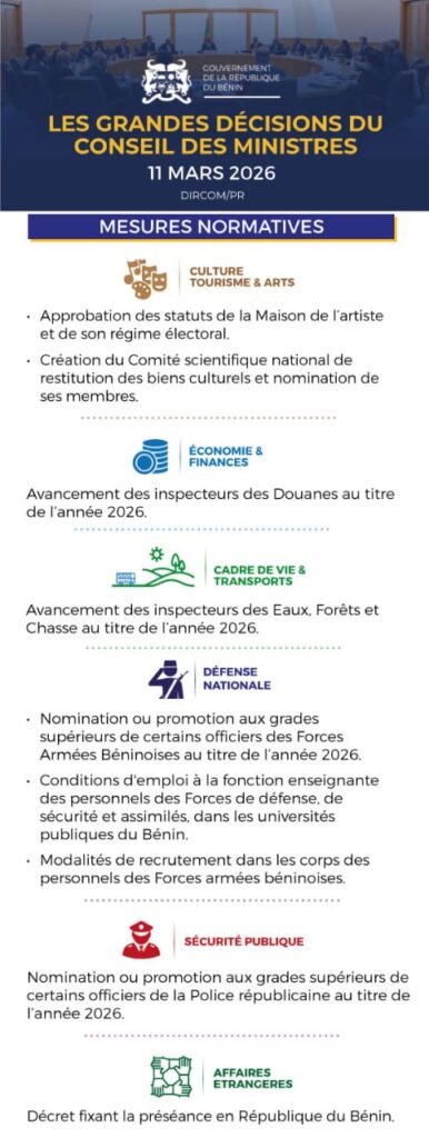 AccueilPolitiqueConseil des ministres : voici les grandes décisions prises Politique Conseil des ministres : voici les grandes décisions prises By Lamazone mars 11, 2026 0 60 Partager FacebookTwitterPinterestWhatsApp Partager FacebookTwitterPinterestWhatsApp Article précédentFootball : voici le classement actuel des top buteurs européensArticle suivantBénin : recrutement de 135 agents des Eaux, Forêts et Chasse Lamazone RELATED ARTICLES Politique Arrestation de Hugues Sossoukpè : RSF porte plainte contre le Bénin et la Côte d’Ivoire devant la CEDEAO avril 28, 2026 Politique CRIET : 2 ans de prison ferme pour Julien Kandé Kansou avril 28, 2026 Politique Bénin : les États-Unis saluent la victoire de Romuald Wadagni avril 24, 2026 LAISSER UN COMMENTAIRE Annuler la réponse Commenter : S'il vous plaît entrez votre commentaire! Nom :* S'il vous plaît entrez votre nom ici Email :* Vous avez entré une adresse email incorrecte! Veuillez entrer votre adresse email ici Site : Enregistrer mon nom, email et site web dans ce navigateur pour la prochaine fois que je commenterai. - Advertisment - Most Popular Real Madrid : Eder Militao opéré avec succès avril 28, 2026 Real Madrid : Aurélien Tchouaméni vers une prolongation avril 28, 2026 Ouidah : trois accidents de route en 24H, voici le bilan avril 28, 2026 Parakou : 6 policiers condamnés pour la mort de Fayçal Ouorou avril 28, 2026 Voir plusCommentaires récentsA WordPress Commenter dans Hello world!