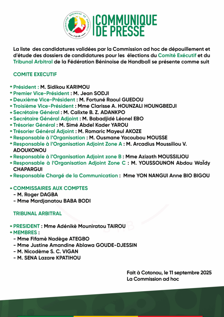La Commission ad hoc chargée d’examiner les dossiers a tranché. Pour les élections des membres Comité exécutif et du Tribunal arbitral de la Fédération béninoise de handball, elle a publié la liste des candidatures retenues. L’annonce a été faite dans un communiqué officiel, daté du 11 septembre 2025.