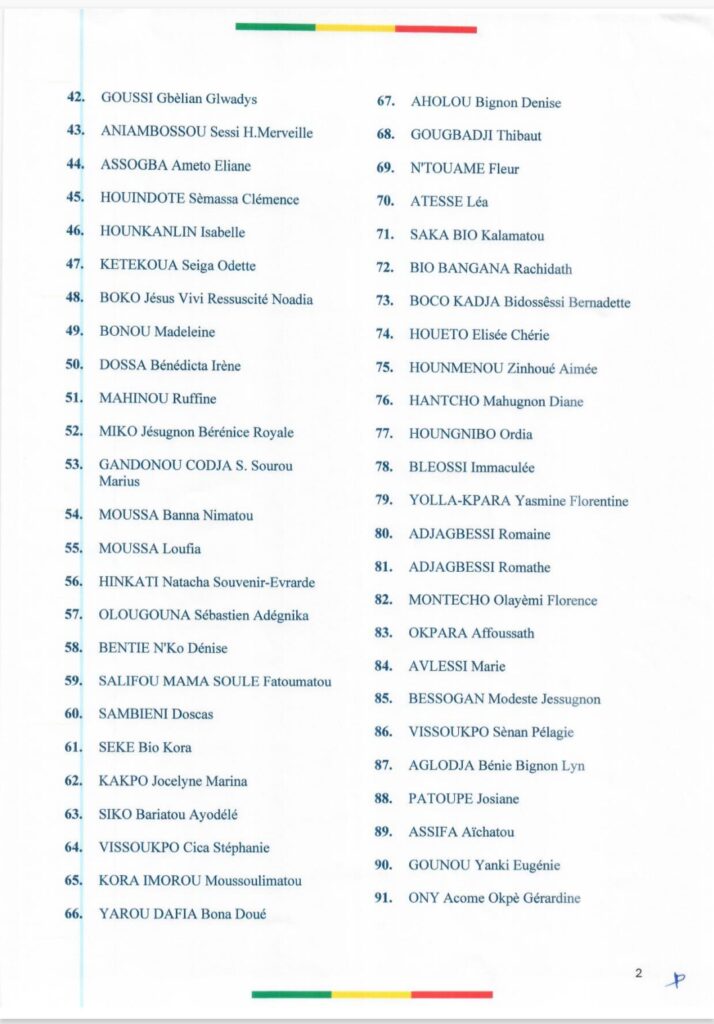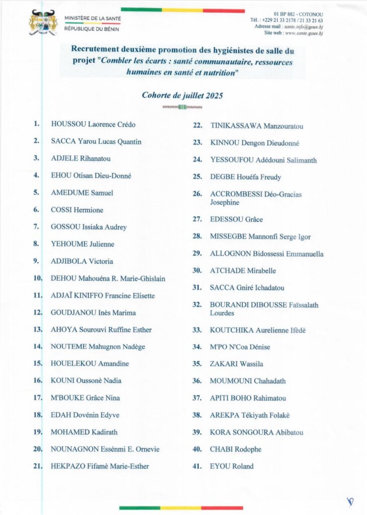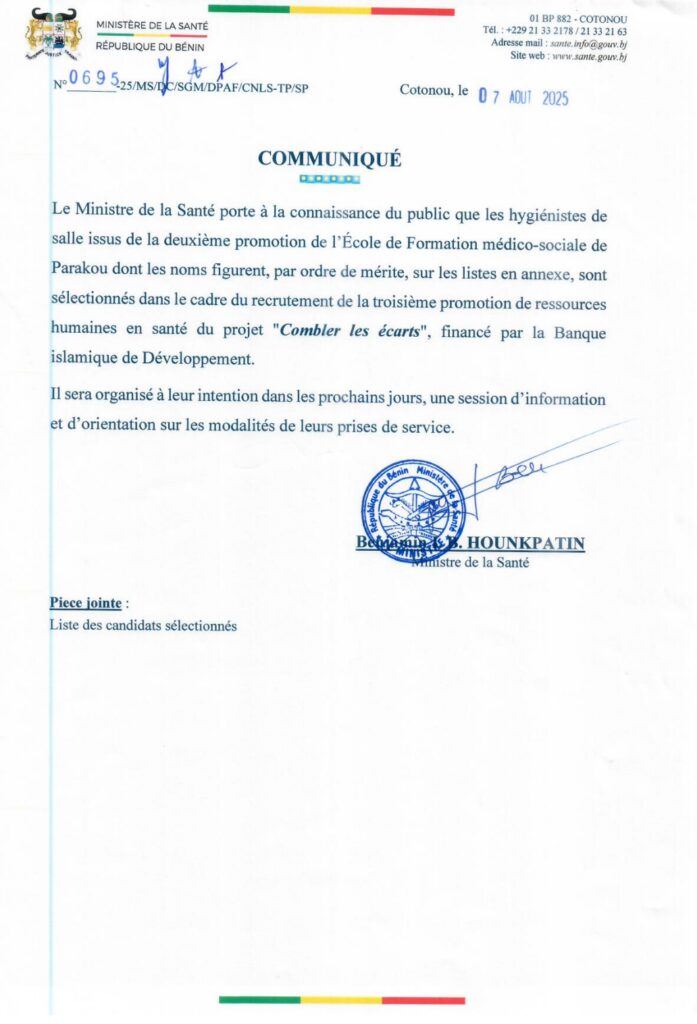 Le Ministre de la Santé informe le public : 91 hygiénistes de salle rejoignent la fonction publique sanitaire. Ils viennent de la deuxième promotion de l’École de Formation médico-sociale de Parakou. Leurs noms figurent, par ordre de mérite, dans la liste en annexe.