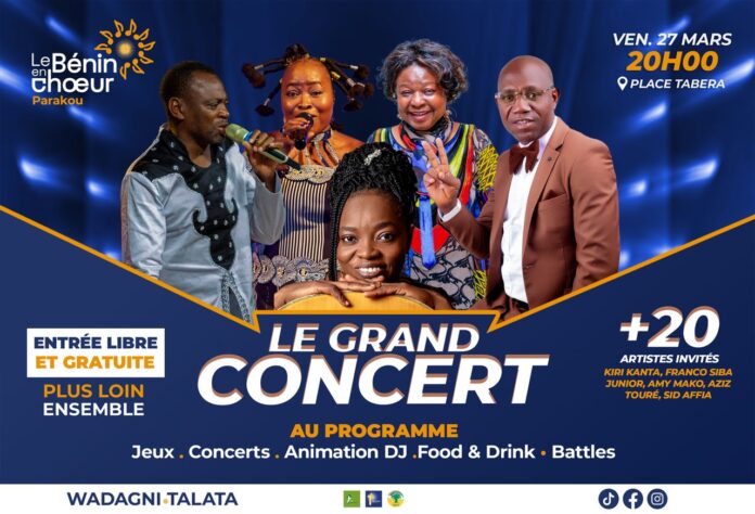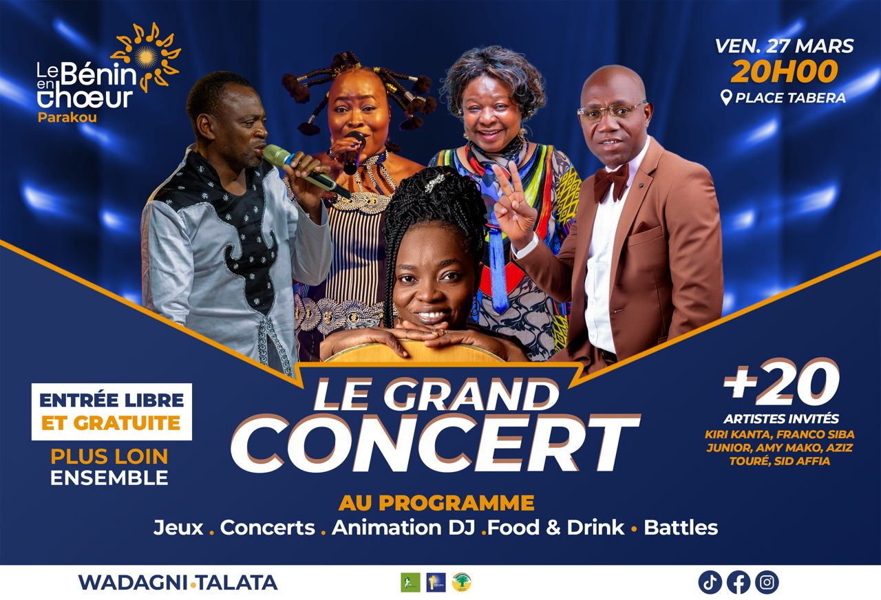 Un grand show est prévu dans la ville de Parakou. Il s’agit du grand concert « Le Bénin en chœur », un rendez-vous artistique qui se tiendra à la place Tabera. Ce vendredi 27 mars 2026, dès 20 heures, plus d’une vingtaine d’artistes montent sur scène pour offrir au public une soirée intense, mêlant rythmes, émotions et communion populaire. Pensé comme un moment de rassemblement, l’événement célèbre la culture et le vivre-ensemble dans une ambiance résolument festive.