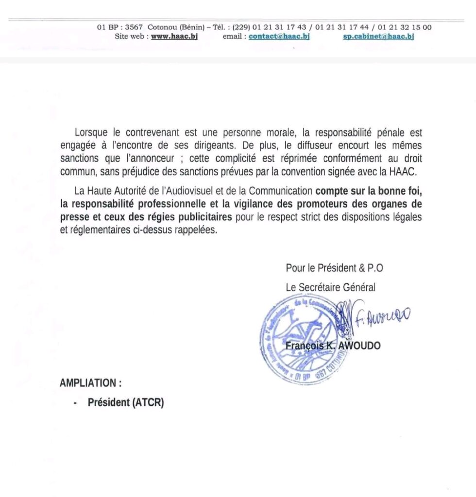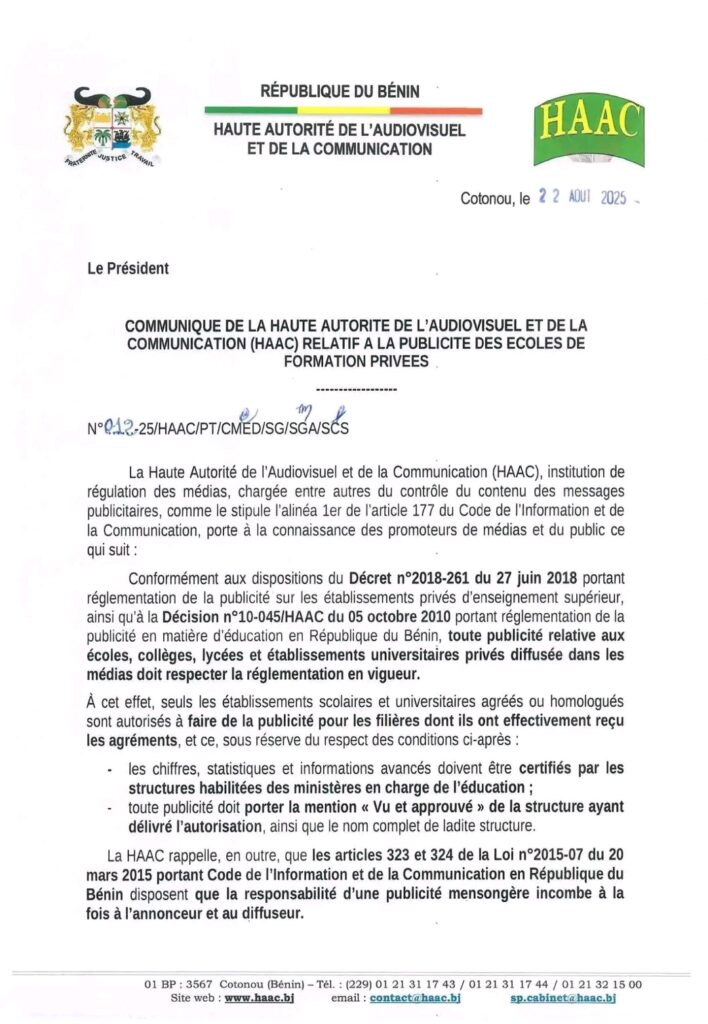 Au Bénin, la Haute Autorité de l’Audiovisuel et de la Communication lance un rappel ferme. Toute publicité concernant une école, un collège, un lycée ou une université privée doit suivre la loi en vigueur. Pas d’exception. Seuls les établissements qui disposent d’un agrément ou d’une homologation sont autorisés à communiquer dans les médias. Mais attention : la publicité ne peut porter que sur les filières réellement approuvées. Autrement dit, un établissement ne peut pas vanter une formation qu’il n’a pas encore le droit d’ouvrir.